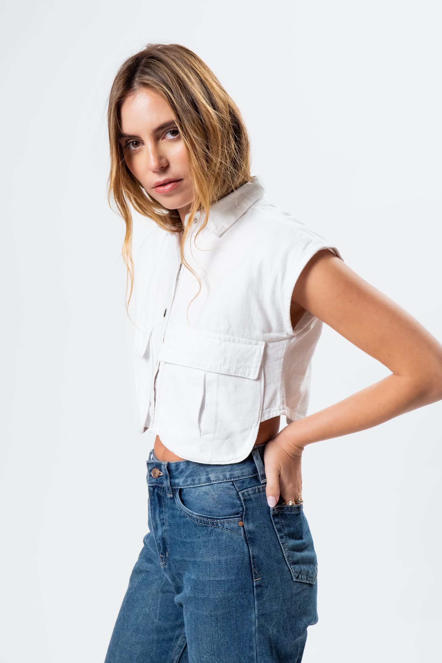 Esta camisa está confeccionada en denim, pero en su versión blanca, lo que le da un toque fresco y versátil, diferente del denim tradicional. Es una prenda esencial que combina comodidad, estilo y versatilidad. Ideal para crear looks casuales o más elegantes con facilidad, perfecta para quienes buscan una opción fresca y moderna en su vestuario diario.