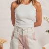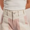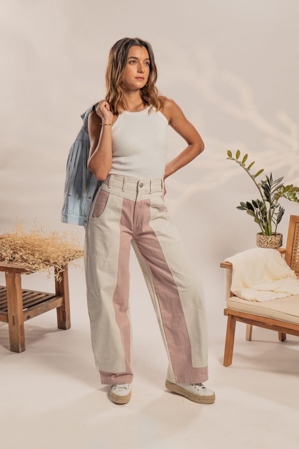 Este pantalón de corte ancho, con silueta balloon, está confeccionado en tela jean 100% algodón, lo que garantiza una estructura firme con una caída fluida y natural. Su diseño de tiro alto y pierna amplia estiliza la figura, ofreciendo comodidad y un aire cómodo. Destaca por sus paneles en tonos crudo y palo de rosa, que aportan un contraste suave y delicado, ideal para looks relajados.