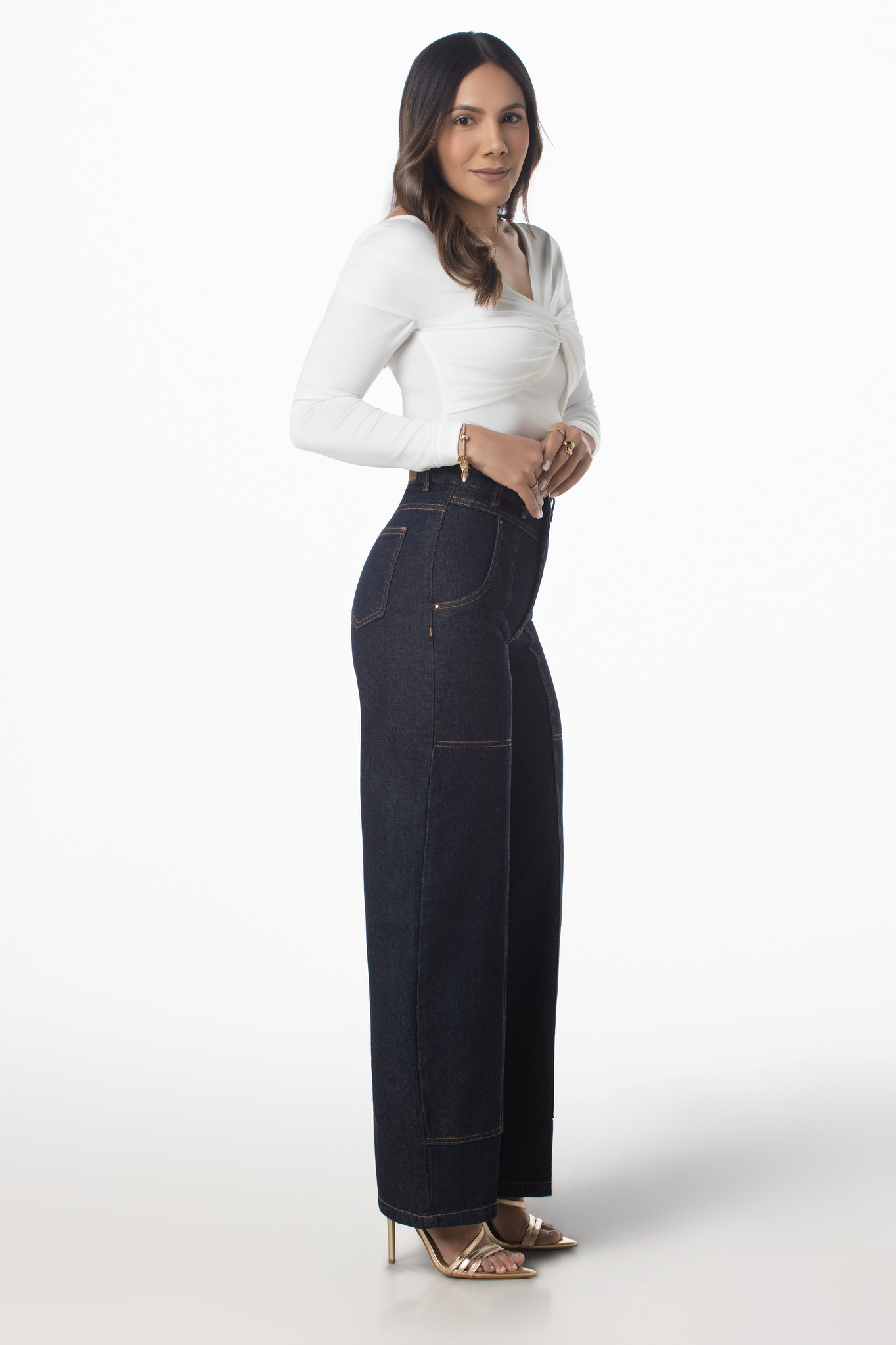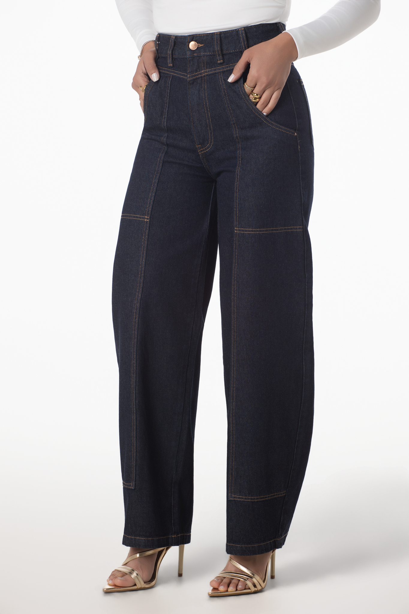 Pantalón de tiro alto con silueta barrel que aporta estructura y modernidad a cada look. Confeccionado en denim rígido de alta calidad, ofrece una caída definida que realza la figura con carácter y elegancia.