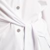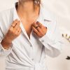 Camisa blanca de corte largo, con una caída que sobre pasa sutilmente la cadera, brindando un aire moderno y relajado. Confeccionada con manga larga y cuello clásico, presenta una hilera frontal de botones con acabado metálico y brillos sutiles, añaden un toque de luz y sofisticación al diseño. El detalle distintivo son sus tiras ajustables al frente, permiten crear un amarre favorecedor, aportando un toque femenino y versátil, ideal para distintos estilismos.
