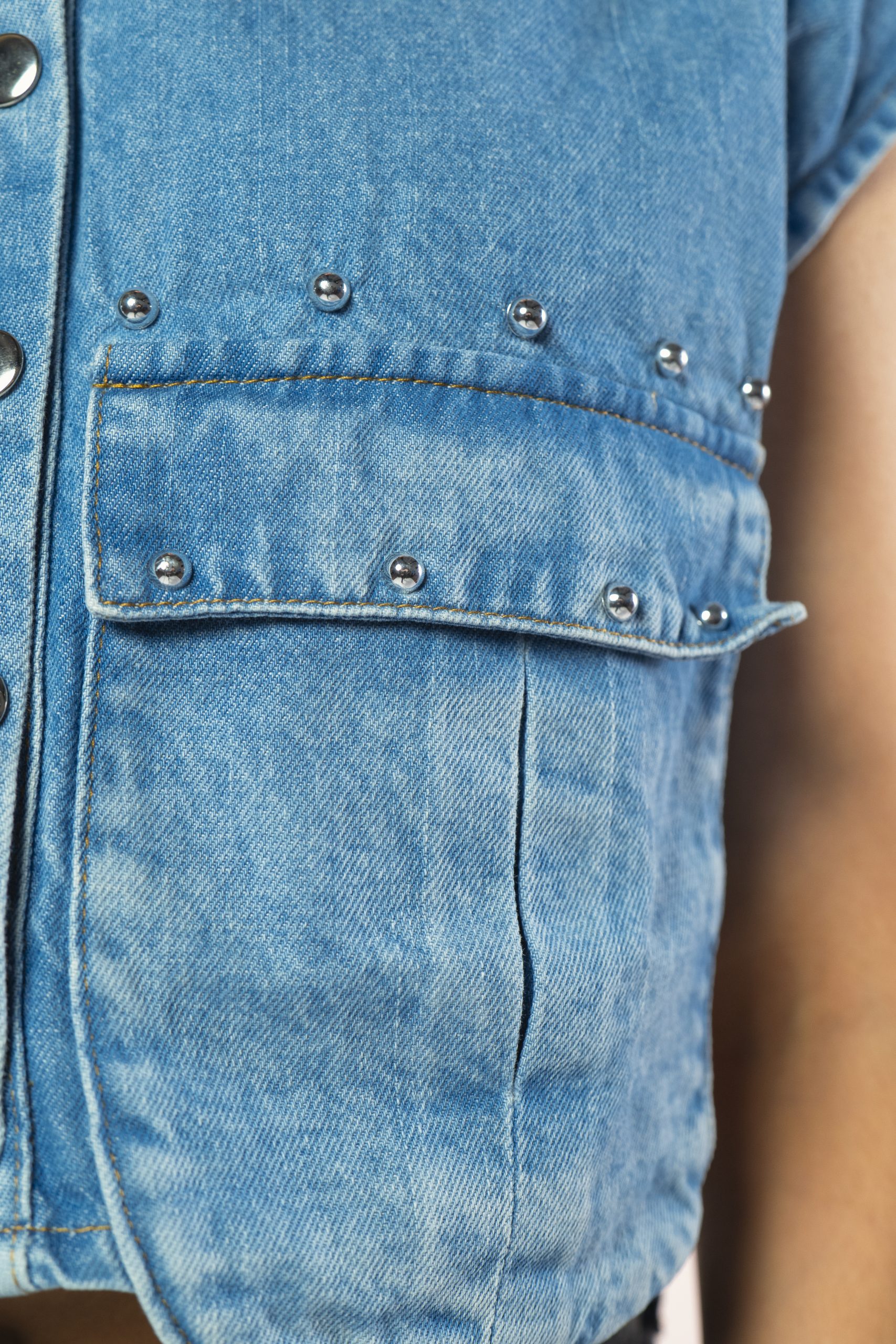 Camisa sin mangas en tela denim en tono azul medio, 100% algodón. Diseño tipo acortado y recto, con cuello basico, broches metálicos y bolsillos tipo cargo, que aportan un aire juvenil y versátil. Ideal para outfits veraniegos o casuales.