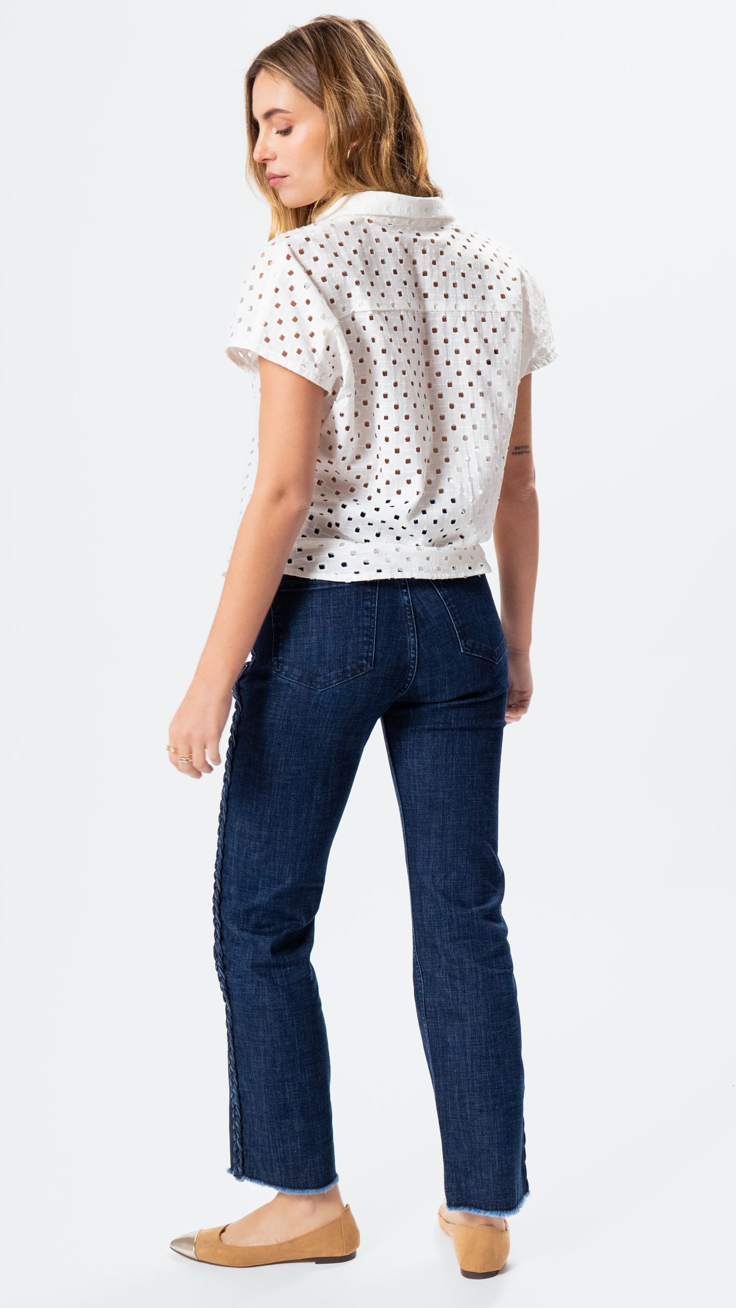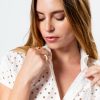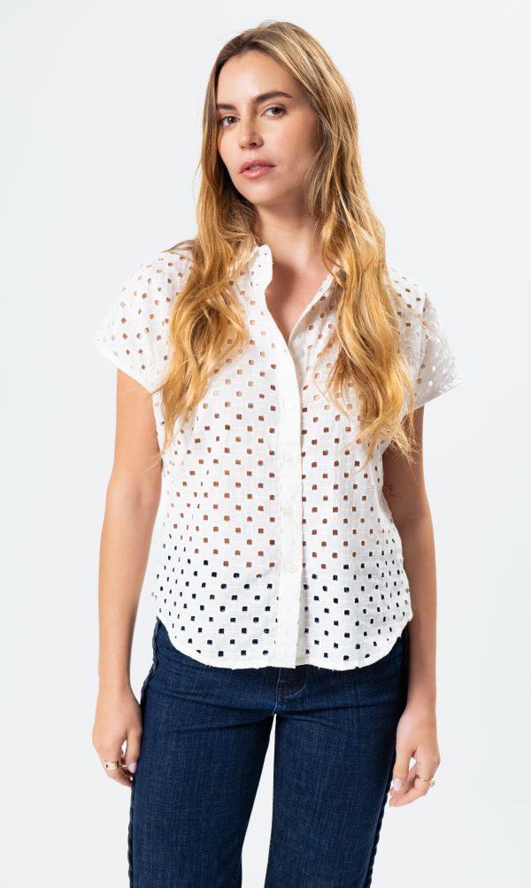 Esta blusa esta confeccionada al 100% en lino, un material natural que destaca por su frescura, suavidad y ligereza. Su diseño presenta detalles de pequeños huecos dispersos a lo largo de la prenda, que añaden un toque delicado y elegante, al mismo tiempo que permiten mayot transpirabilidad. El lino ofrece una sensacion fresca, comoda, ideal para climas calidos.
