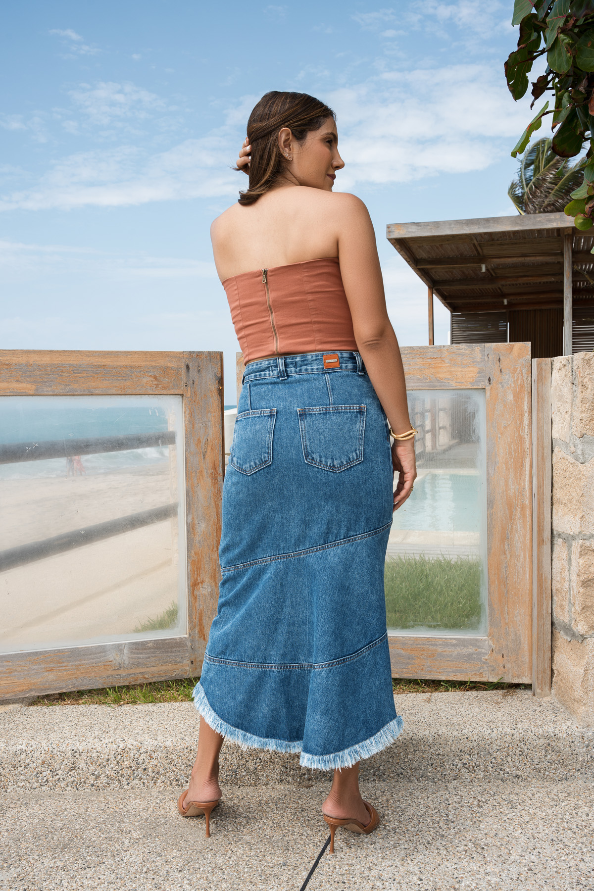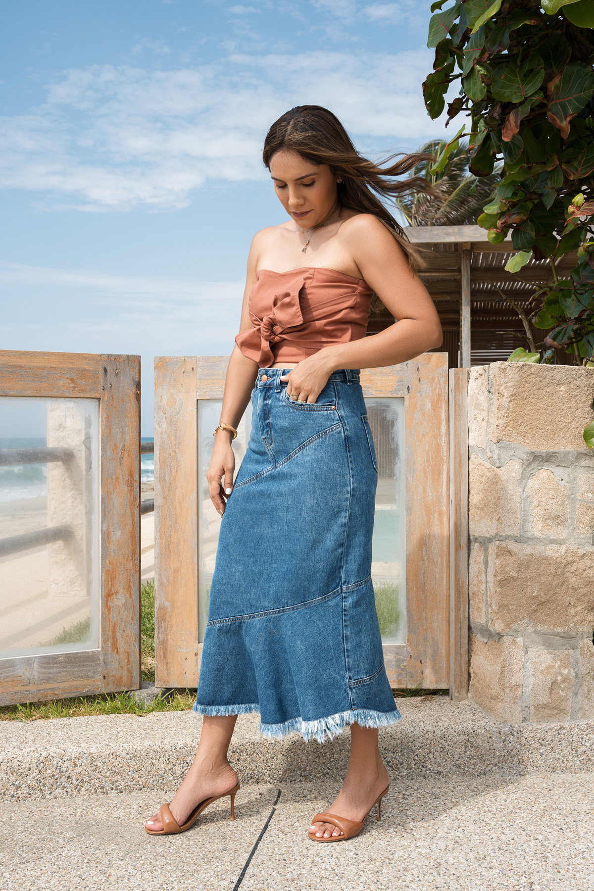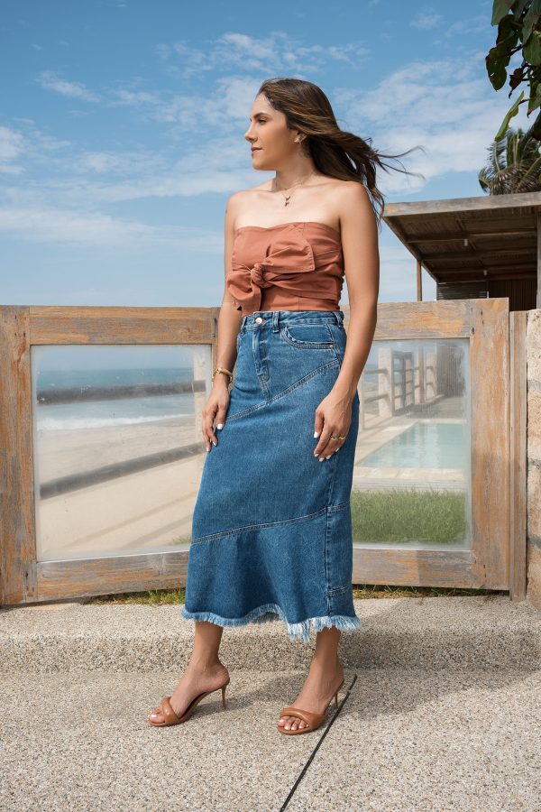 Fabricada con algodón 100% rígido, este material es conocido por su resistencia y su capacidad para mantener su forma con el tiempo. Tiene un diseño ajustado que realza la figura, especialmente en la zona de las caderas y glúteos, dando un efecto de ‘levantamiento’ y estilización, terminando con un vuelo al final.