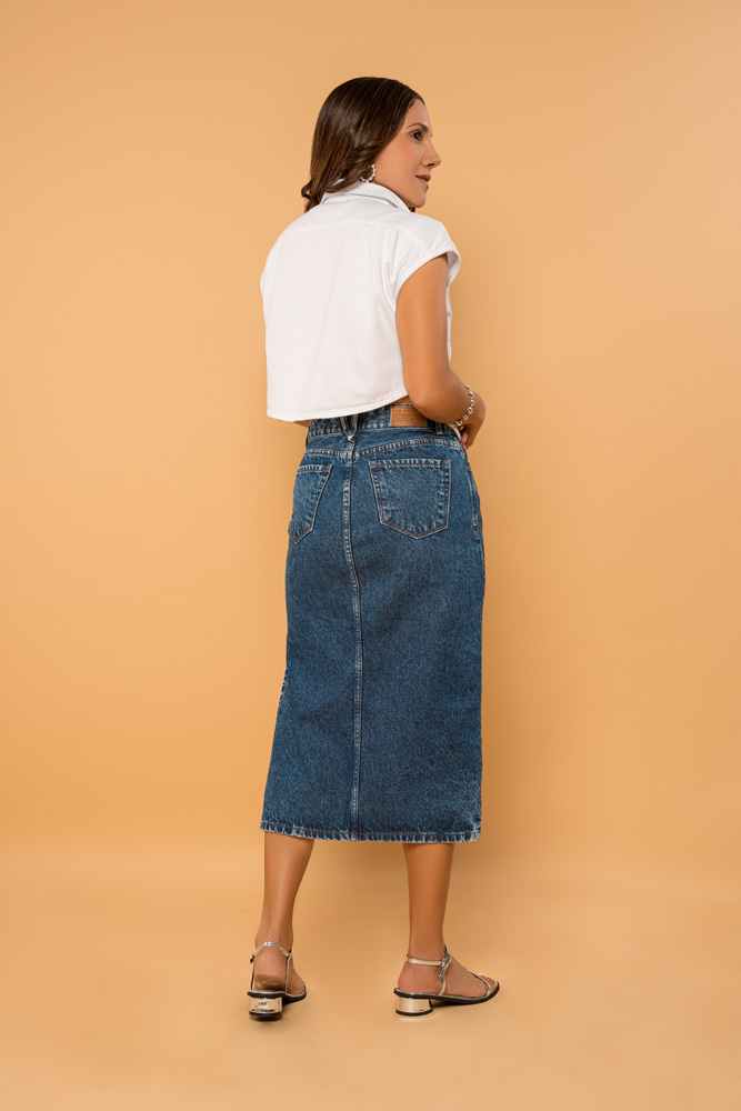 Tejido de algodón denim azul. Diseño midi. Diseño recto. Pasadores. Cinco bolsillos. Cierre y botón. Abertura en el bajo parte del costado delantero.