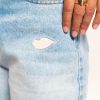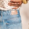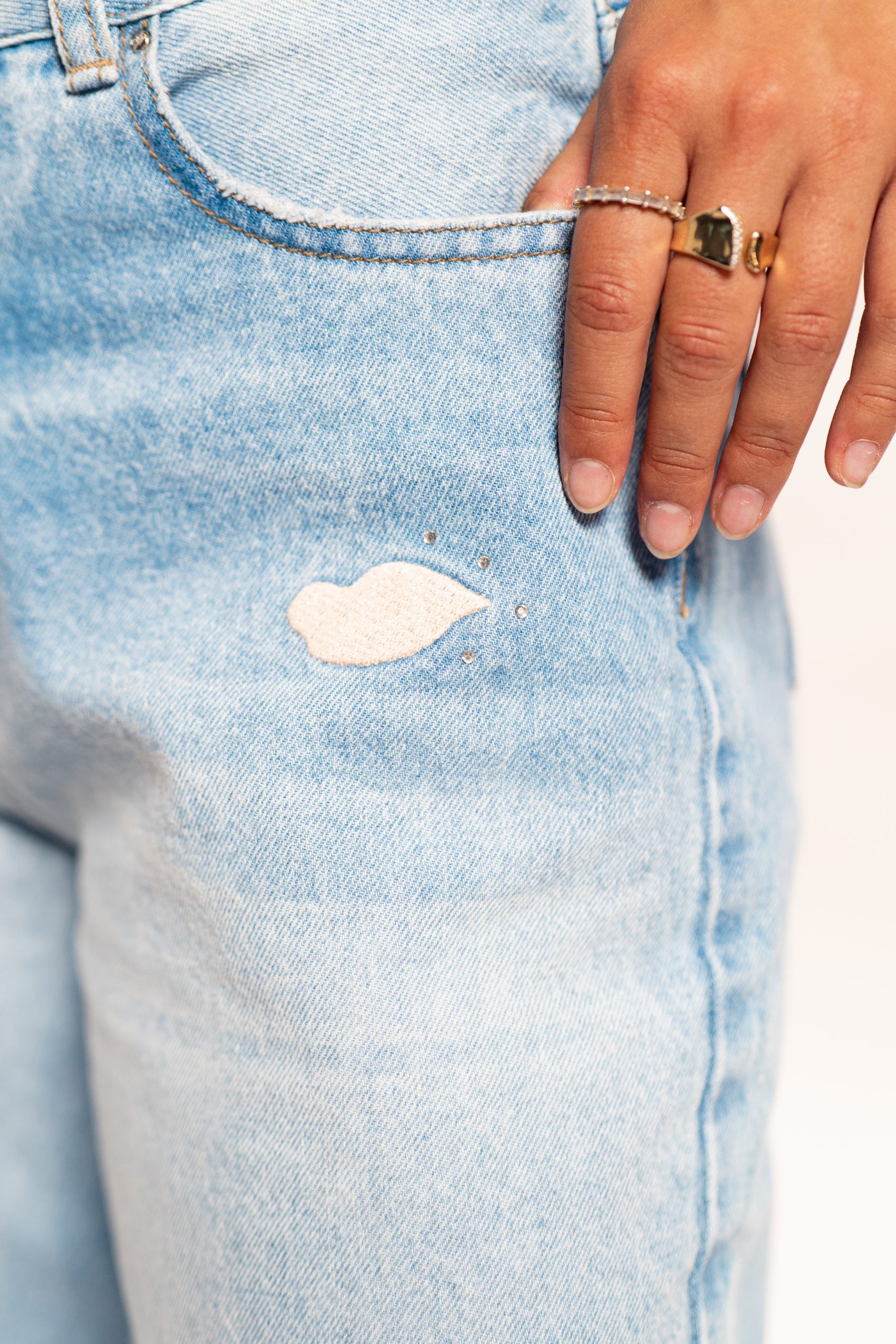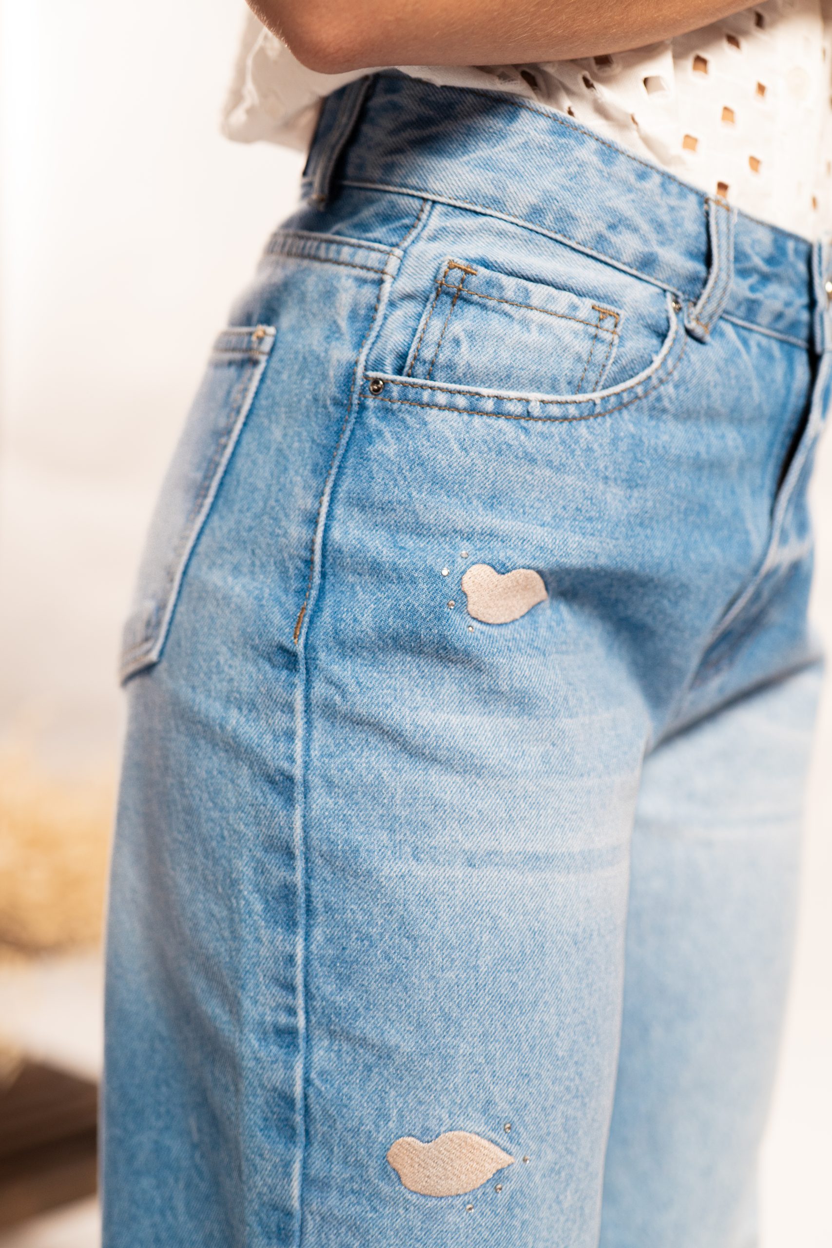 Confeccionado en tela 100%algodón rígido, en estilo mom, ofreciendo una estructura firme, cómoda y con un tacto natural. Su silueta clásica de tiro alto y pierna recta brinda un ajuste relajado y favorecedor. Como detalle distintivo, incorpora pequeños bordados de besos enla parte delantera con apliques brillantes adhesivos, que aportan un toque artesanal y original sin perder la esencia minimalista del denim.