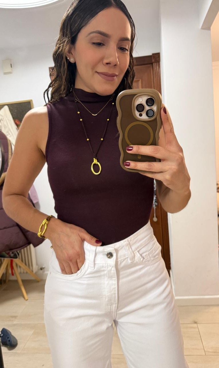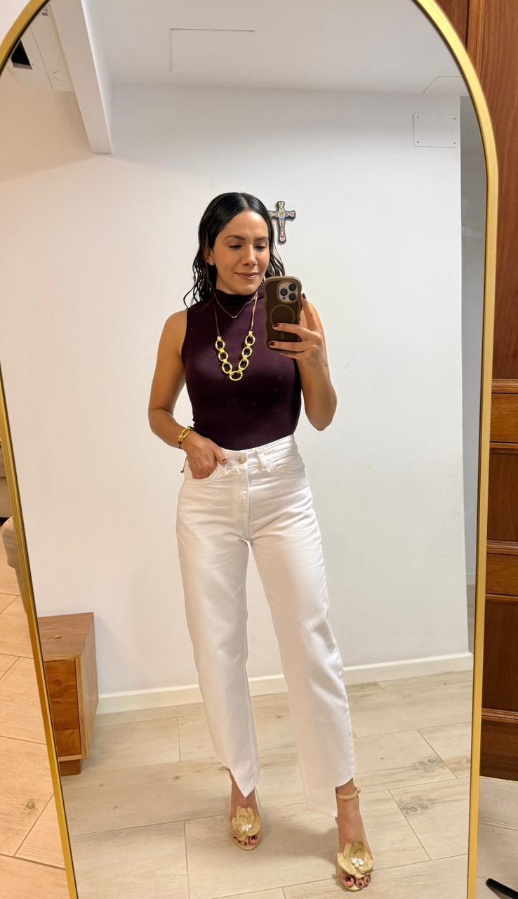 El pantalón es un jean de tiro alto en tono blanco, con un diseño limpio y estructurado. Tiene un corte recto ligeramente amplio, lo que estiliza la figura y alarga visualmente las piernas. Es un modelo versátil que combina perfectamente con prendas ajustadas en la parte superior