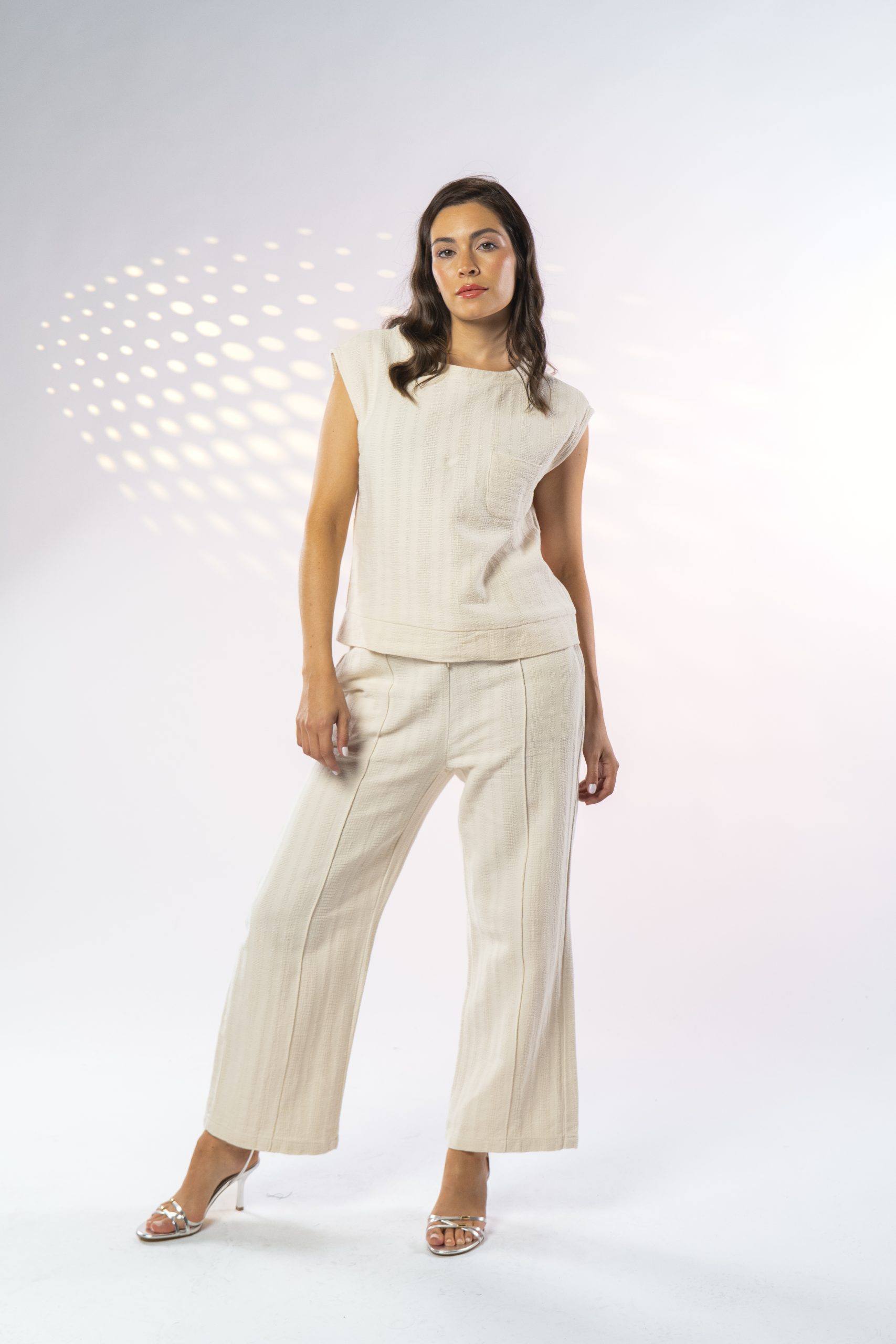Este set en tono crudo evoca una estética natural y serena, perfecta para quienes buscan un look fresco y sin esfuerzo. La blusa sin mangas tiene un corte limpio y minimalista, con cuello redondo y una caída suave que acompaña sutilmente el movimiento del cuerpo. El pantalón, de tiro alto y pierna recta ligeramente amplia, ofrece comodidad sin perder estructura, estilizando la figura con un aire relajado.