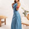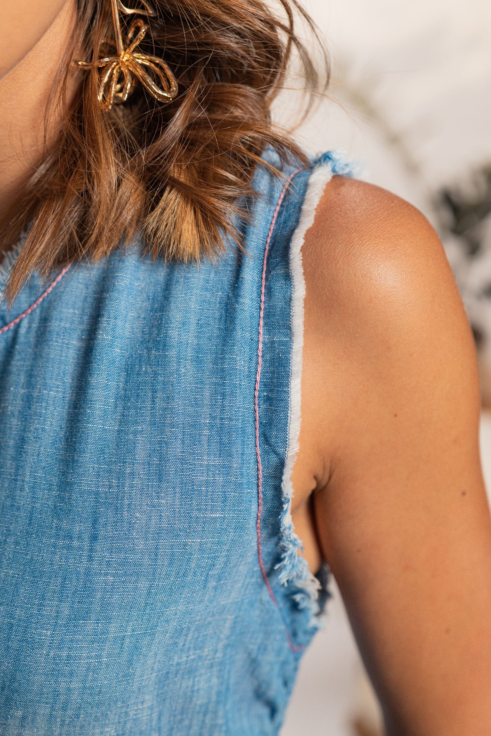 Vestido largo confeccionado en 100%algodón eco-denim liviano, ideal para un look fresco y natural. Su diseño sin mangas presenta terminaciones deshilachadas, un delicado lazo ajustable en la espalda y un fruncido lateral que estiliza la figura con sutileza. La falda cae de forma amplia hasta los tobillos, combinando comodidad con un toque boho chic perfecto para el día a día.