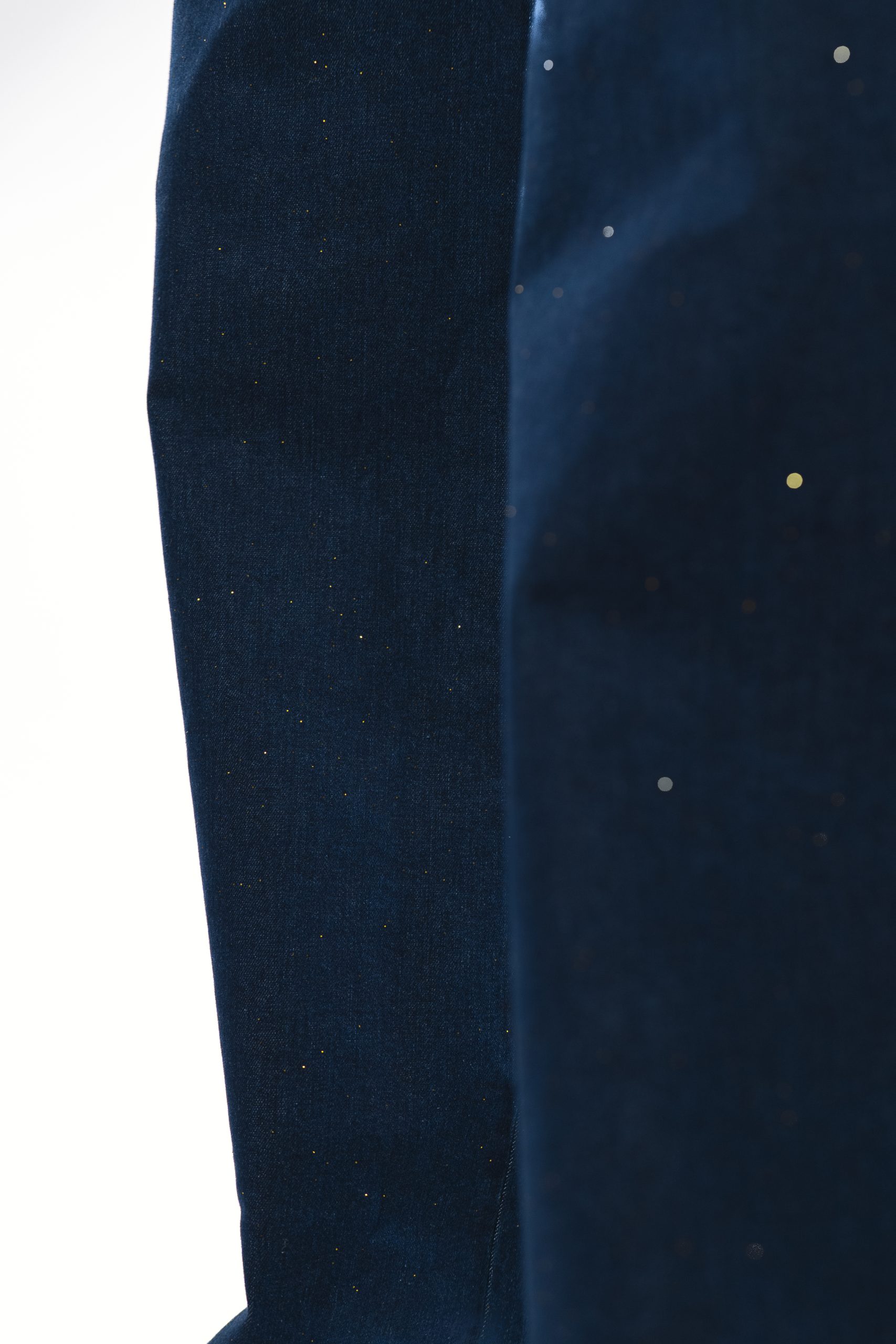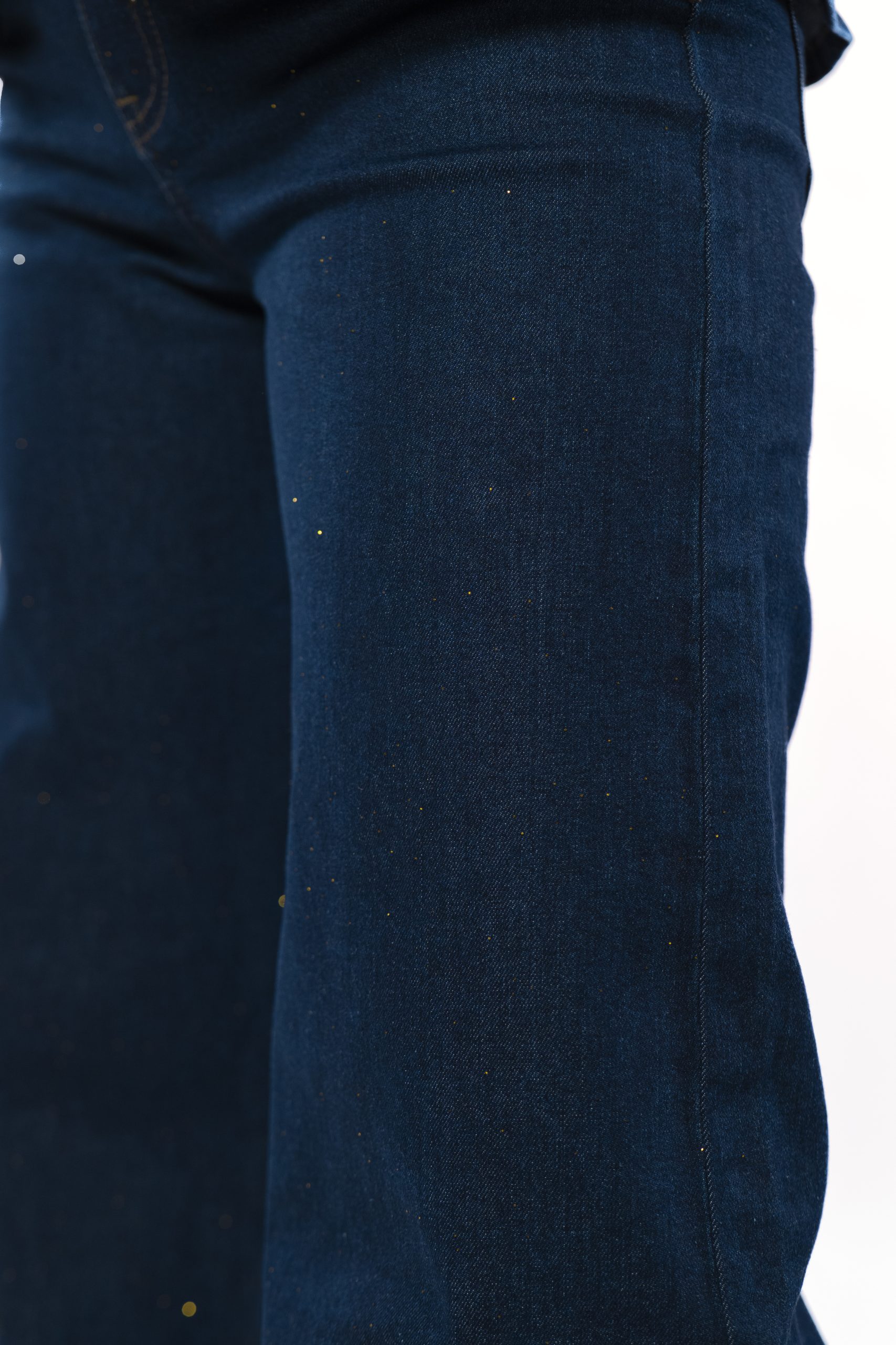 Pantalón confeccionado en denim azul oscuro profundo con elastano. Diseño limpio y elegante, corte holgado y caída que estiliza la silueta. Su acabado sutil de escarcha dorada refleja destellos simulando estrellas, aportándole un toque distintivo y cómodo. Esta pieza única y diferente a cualquier jean clásico es perfecta para looks versátiles de oficina o casual chic. Se puede combinar con camisas blancas, crop tops o chaquetas cortas.