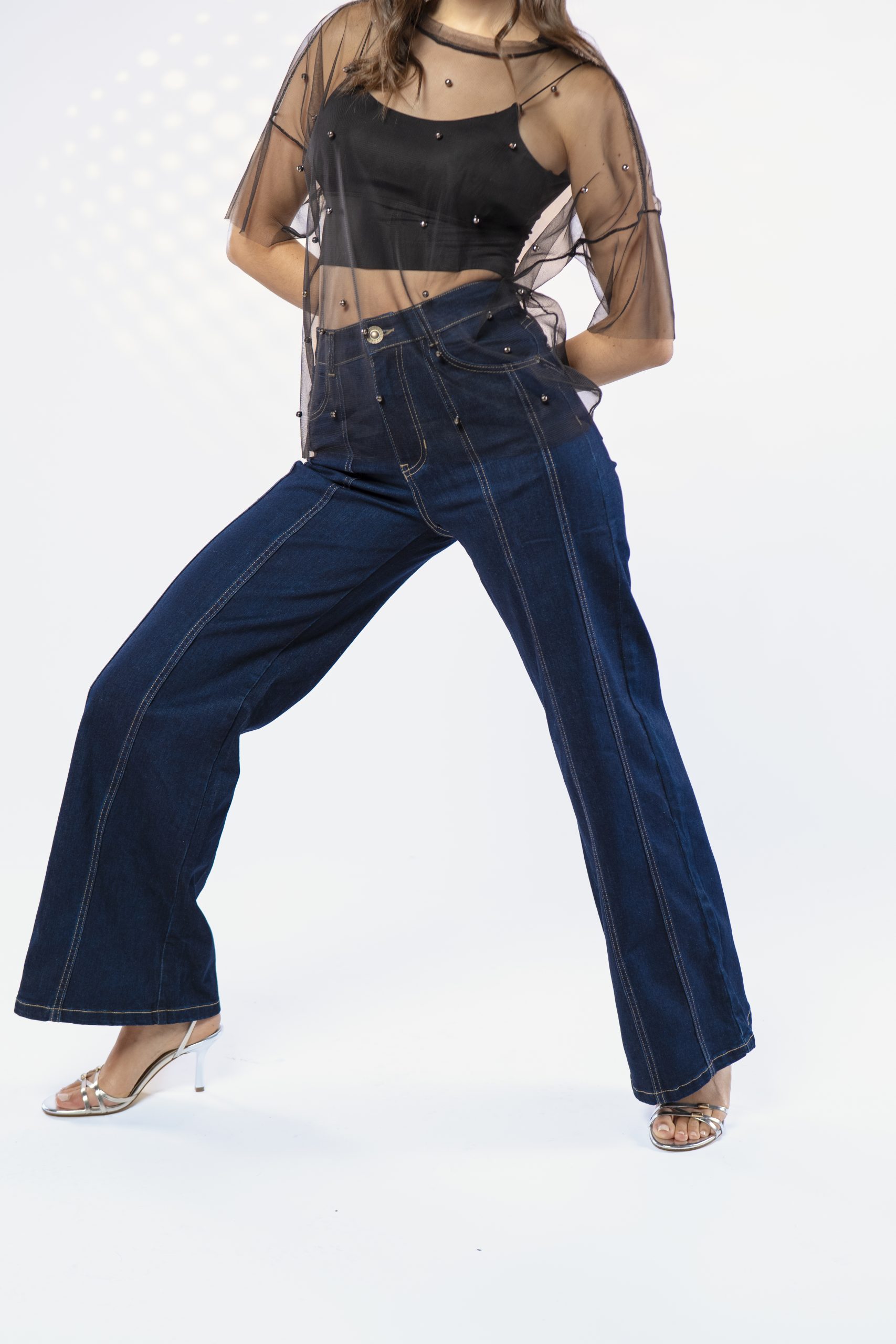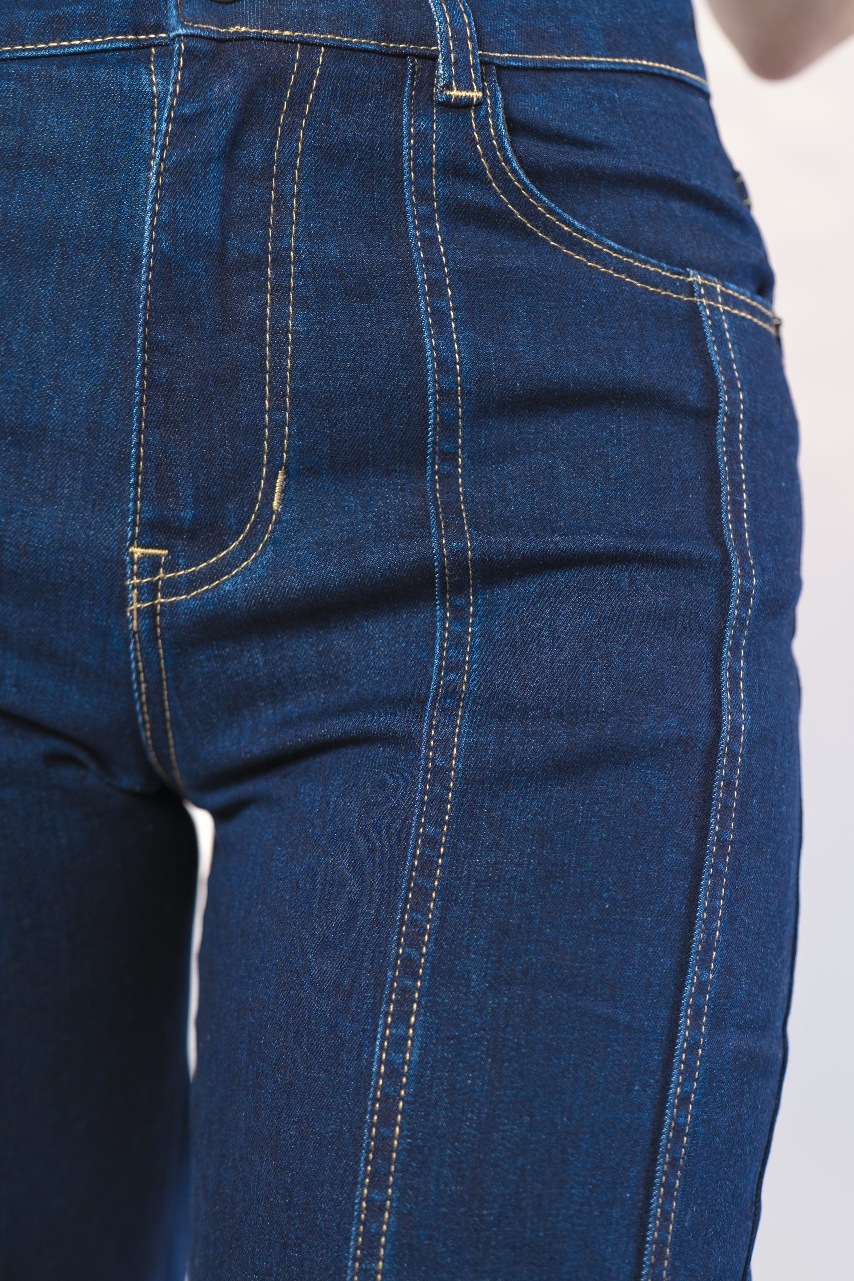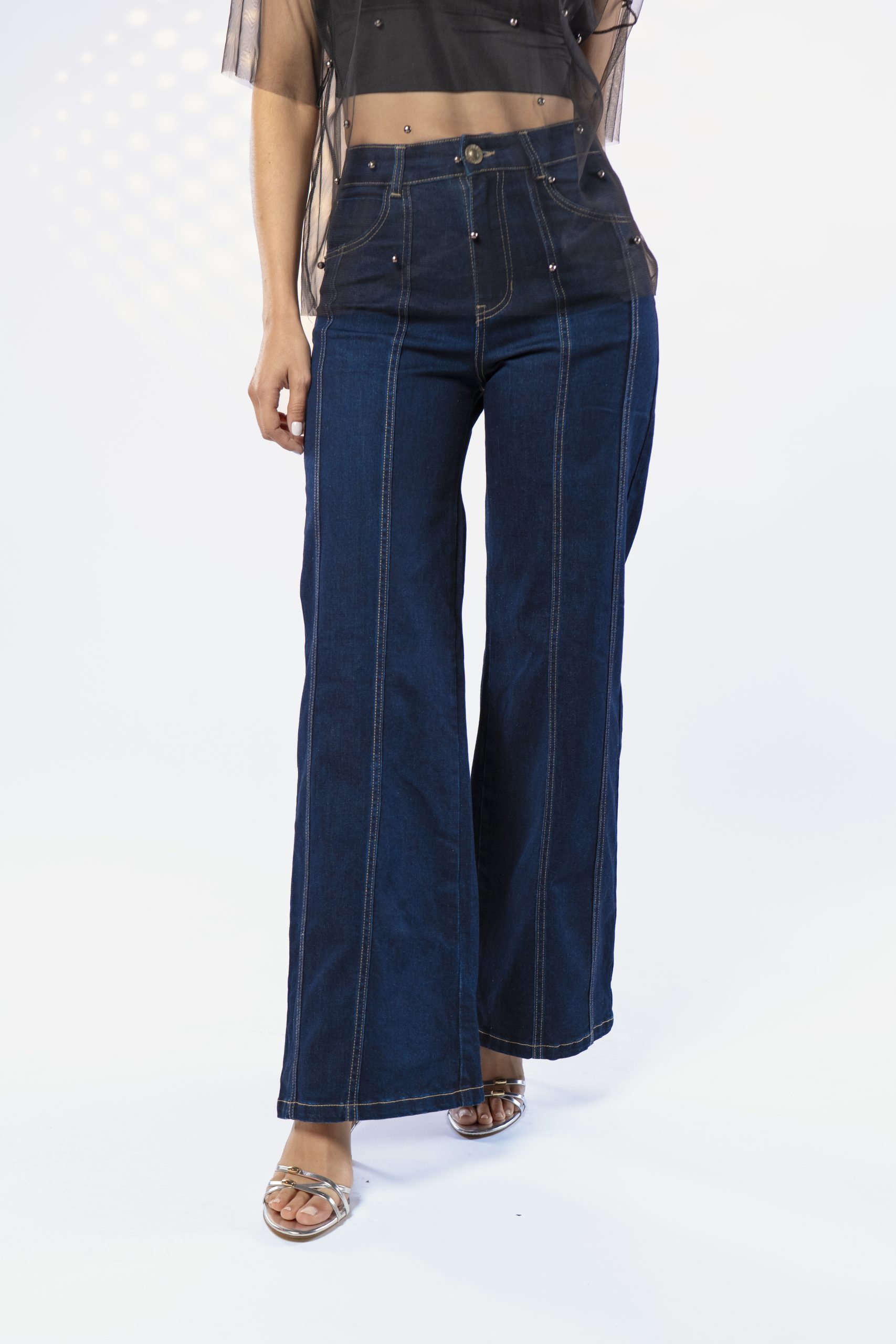 Pantalón corte wide leg en tela denim stretch en tono azul oscuro. De tiro alto, corte vertical en piernas, con costuras decorativas que estilizan y alargan visualmente la figura, logrando un estilo moderno y fresco con carácter.