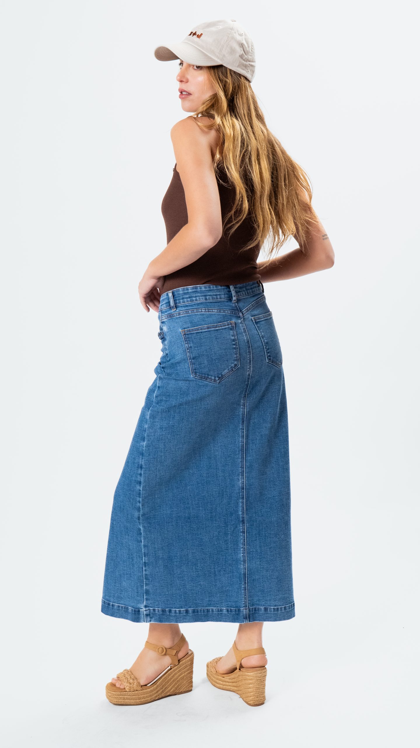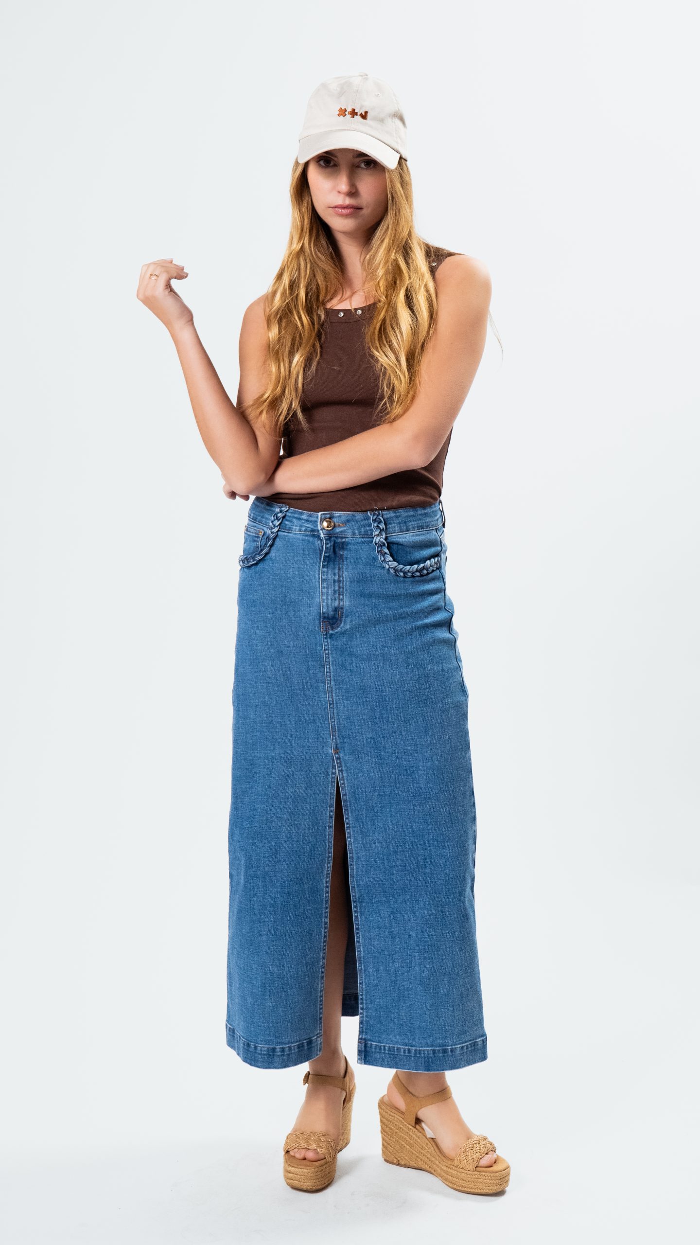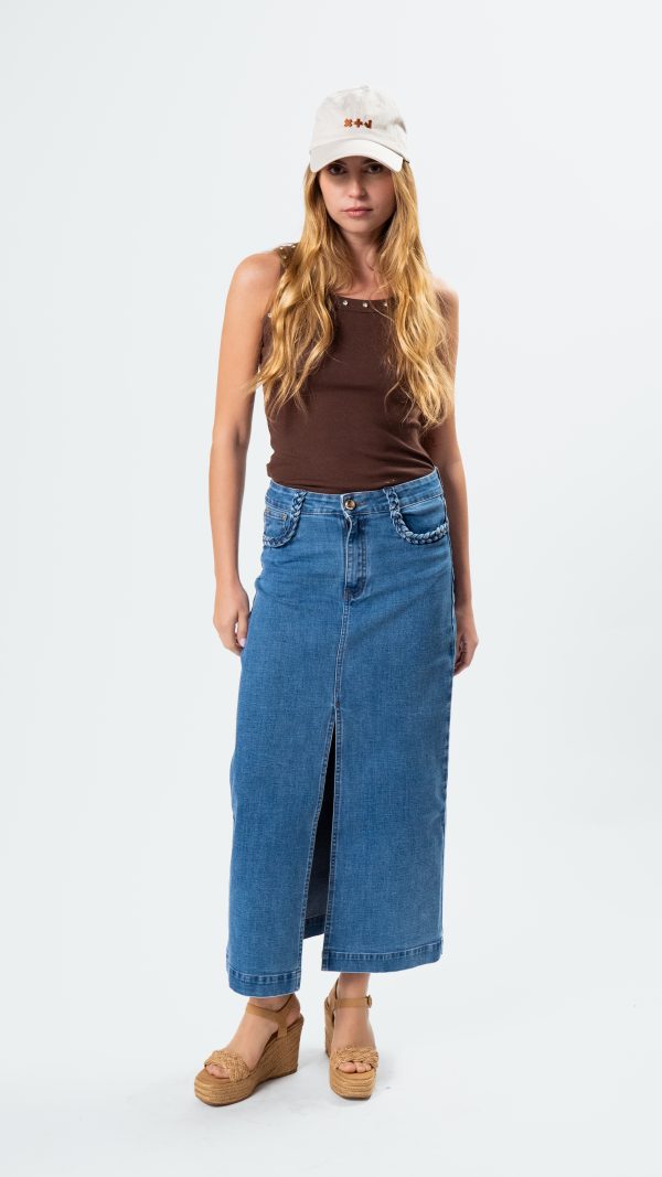 Esta falda combina estilo y comodidad en una sola prenda, presenta una abertura en la mitad de las piernas que añade un toque de sensualidad y facilita el movimiento. El diseño se ve realzado por detalles de trenzado en los bolsillos, que aportan un toque artesanal y moderno.